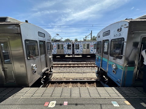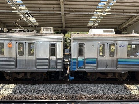 特に中間のモハ8104は、8000系の初期の軽量ステンレス車の姿をそのままとどめている大変貴重な車両です。